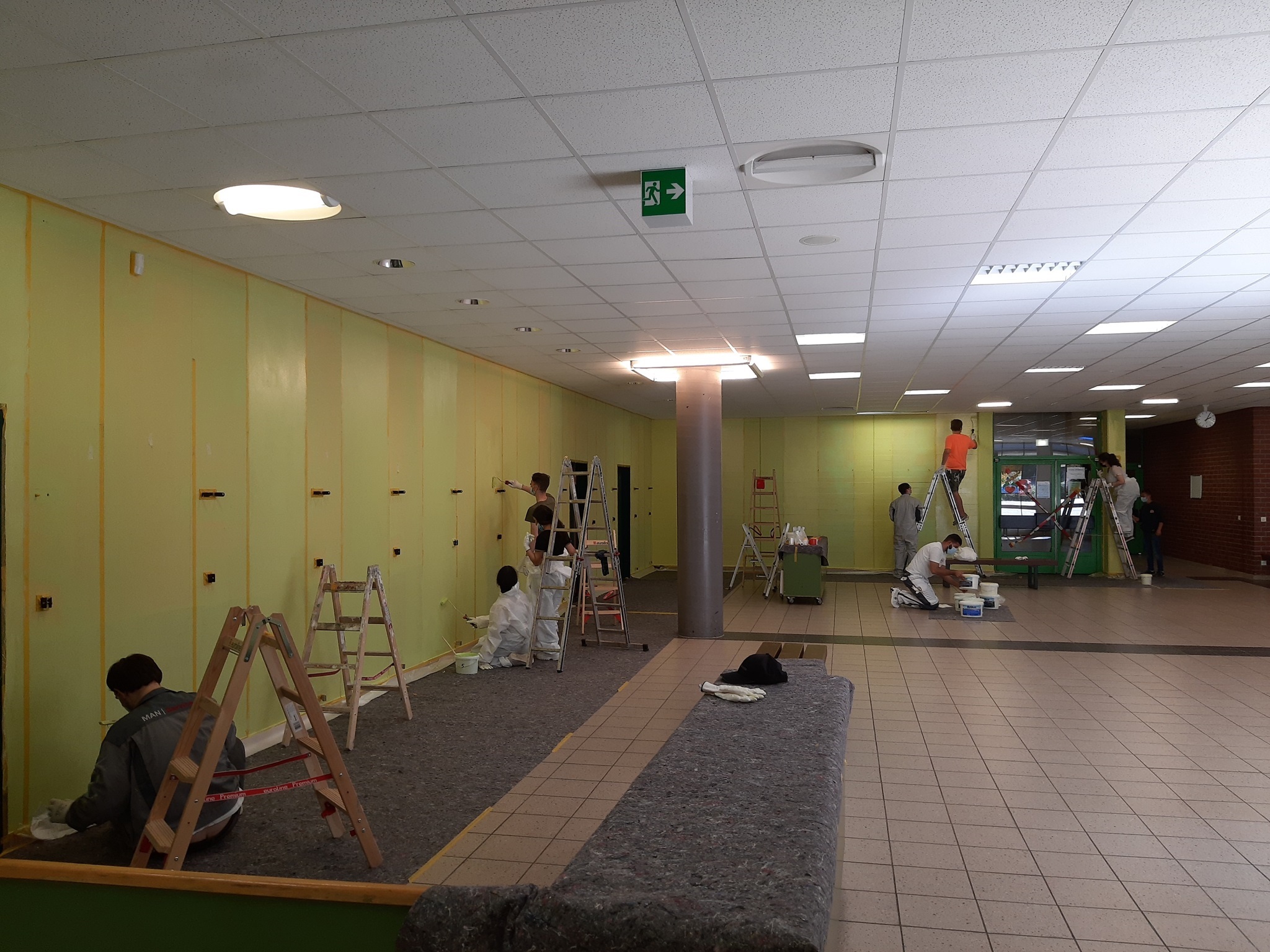 Im Rahmen eines gemeinsamen Projekts mit dem städtischen Gymnasium Gevelsberg haben Schülerinnen und Schüler der Gemeinschaftshauptschule Gevelsberg die kahlen Wände der Mensa des Schulzentrums in eine bunte Landschaft verwandelt.