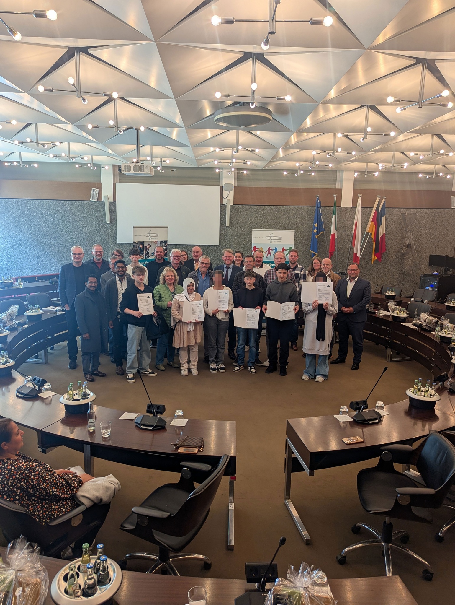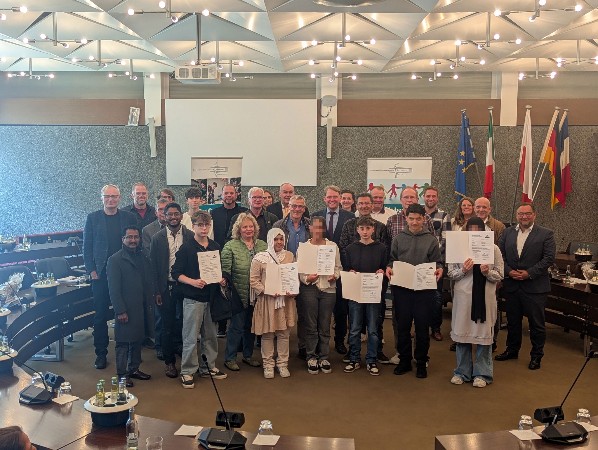 Am 6. Mai 2025 empfing Bürgermeister Claus Jakobi in feierlichem Rahmen im Ratssaal Gevelsbergs die acht Schülerinnen und Schüler des aktuellen 8. Jahrgangs der Gemeinschaftshauptschule sowie deren Patinnen und Paten. Außerdem waren die Familien eingeladen und weitere Mitglieder des Netzwerkes Gevelsberger Ausbildungspakt 2.0.
