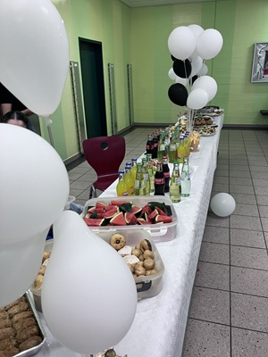 Abgerundet wurde der Abend durch die abschließende Zeugnisverleihung und einen Ausklang im Foyer der Schule, in dem ein Buffet mit deftigen Snacks, Süßspeisen und kalten Getränken vorbereitet worden war.